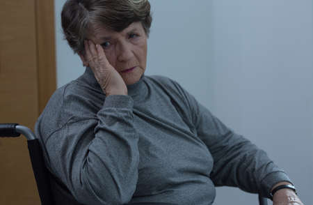 Aged sad woman on wheelchair in home