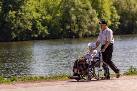 05/26/2018, Moscow, Russia. an old man is rolling an old woman sitting in a wheelchair. elderly couple on a walk along the river.