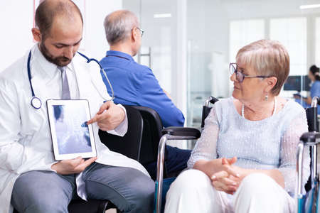 Doctor holding tablet pc with x-ray while explaining diagnosis to disabled elderly woman in wheelchair. Handicapped patient in hospital waiting area. Man in examination room.