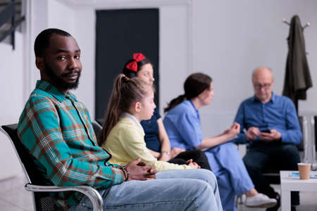 Portrait of african american patient waiting for doctor in private clinic while nurse is checking appointments with other patients. Man sitting down in hospital reception with mixed aged people.