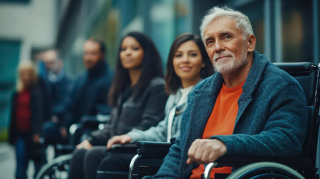 A diverse group of individuals in wheelchairs participates in a community event, demonstrating inclusivity and connection among people of different backgrounds and generations.