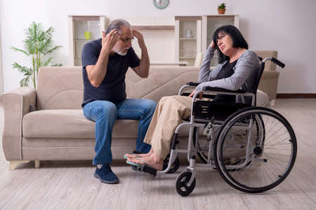 Mature man with disability in wheelchair spending time together with his wife at home