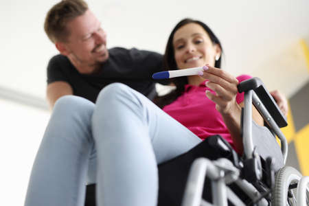Disabled woman in wheelchair is holding test with her husband at home. Pregnancy and childbirth disabled women concept.