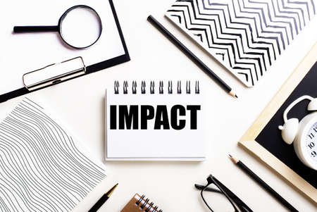 On a white table are notebooks, glasses, a pen, an alarm clock and a notebook with the word IMPACT
