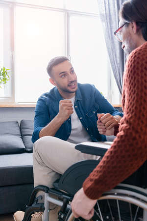 Medical worker talking with a young man in a wheelchair before training in the rehabilitation center. Concept of medical care and support for people with injuries