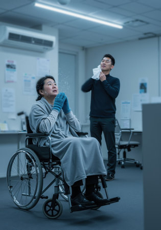 Woman in wheelchair feeling cold with ice particles while man sweats in hot office during temperature conflict.
