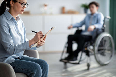 Female psychologist working with handicapped adolescent in wheelchair at office, copy space