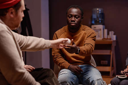 Horizontal shot of young Caucasian man passing ball to African American man during group therapy session