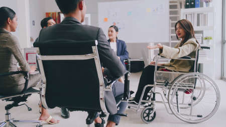 Confident business woman in wheelchair presenting during business meeting with colleagues.