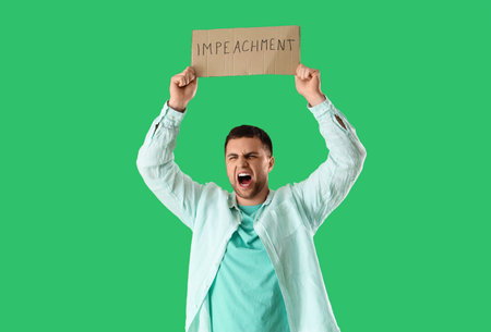 Protesting young man holding placard with the word IMPEACHMENT on green background