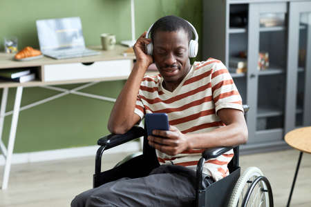 Portrait of smiling black man with disability listening to music and using phone in modern home, copy space