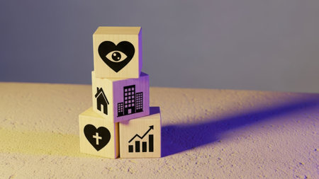 This image features a stack of four cubes, each displaying a different icon: a heart with an eye, a house, a cross, and a bar graph. The cubes are arranged in a pyramid formation with a white background. The image is on a transparent background, making it suitable for various design applications. Key elements include symbols of love, home, faith, and growth.