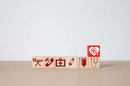 Wooden stacking with healthcare medical and hospital icons on table , Health and insurance concept.