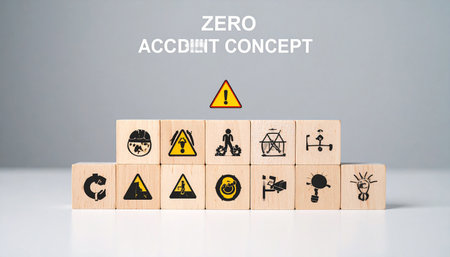 ZERO ACCIDENT CONCEPT. Wooden cubes with icons on grey background