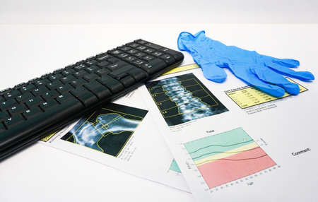 Soft and blurry image:Bone Densitometer hip and spine report paper under keybord .on the teble doctor room white background