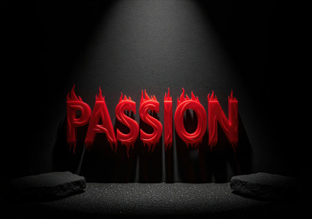 The word PASSION is displayed in bold, sculpted ruby red letters with a flame like effect, dramatically lit by a single spotlight, casting long shadows. this evokes strong emotions and intensity.