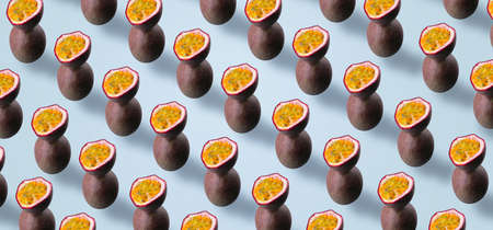 Cut ripe passionfruit and melted ice cubes on a black background. Close-up.