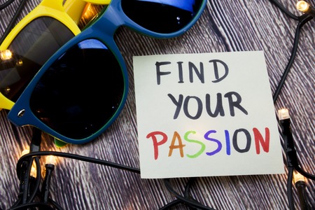 Follow your passion on Sticky note with sunglasses, wooden background with lights concept dreams aspirations
