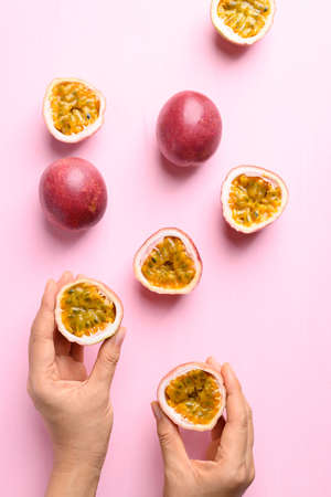 Passion fruit with hand on pink background, Tropical fruit in summer season
