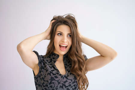 A cheerful woman holds her head with her hands in surprise on a white background