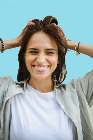 Portrait of a young beautiful cute cheerful woman smiling looking at the camera on blue background.