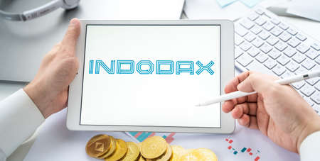 Russia Moscow 05/06/2021 Businessman with tablet.Logo of cryptocurrency stock exchange Indodax.Trading blockchain platform to buy, sell digital crypto coins, tokens Bitcoin, Ethereum.Business, investing.