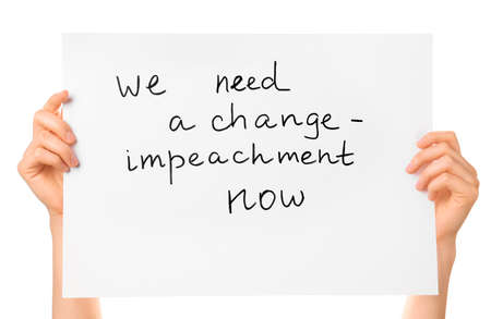 Hands holding paper with text WE NEED A CHANGE - IMPEACHMENT NOW on white background