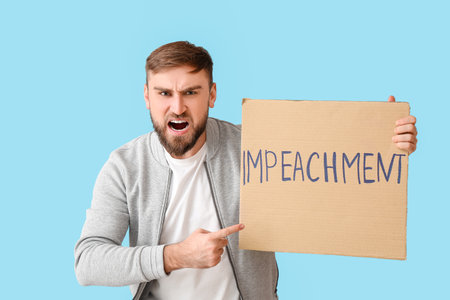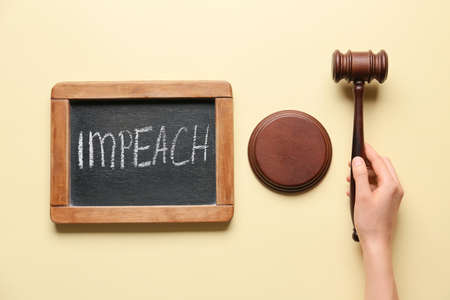 Hand with judge gavel and chalkboard with text IMPEACH on color background
