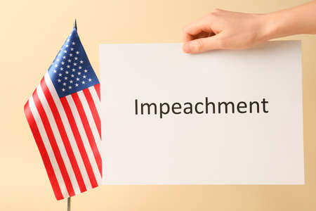 USA flag and hand holding paper with text IMPEACHMENT on color background