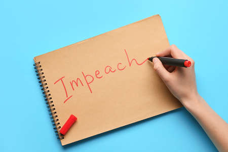 Female hand with black letters spelling word IMPEACHMENT on blue background
