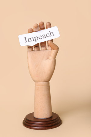 Wooden hand with judge gavel and word IMPEACH on beige background