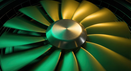 Close up of a computer fan with spinning blades illuminated by vibrant green and yellow light, creating a dynamic motion blur effect. Represents technology, cooling, and airflow.