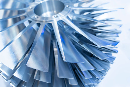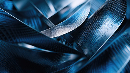 A detailed view of blue metallic turbine blades with smooth curved edges, reflective material, and gradient lighting, emphasizing engineering and industrial design.
