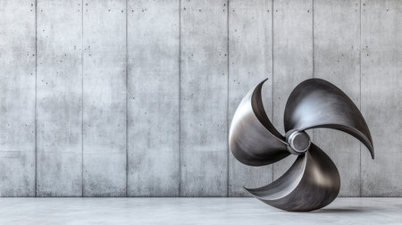 A striking metallic propeller sculpture stands against a smooth concrete wall, showcasing a modern and industrial aesthetic perfect for creative spaces.