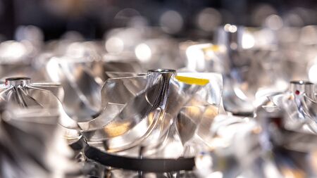 This image showcases a detailed close-up of a metallic component with a stunning design, reflecting light in an industrial setting.
