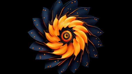A captivating abstract artwork featuring a spiral floral design with a blend of orange and blue hues against a black background.