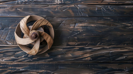 A close-up photograph of a wooden wheel, carved in a five-pointed star shape, resting on a dark wooden plank surface. The wheel is intricately crafted with multiple layers of wood, and the surface of the planks is rough and textured, giving the image a rustic feel. The wheel is positioned on the left side of the frame, and the remaining space is filled with the dark, wooden planks, creating a simple yet elegant backdrop.