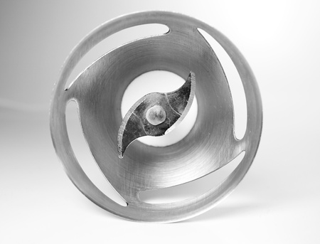 Large metallic propellor with blue background.