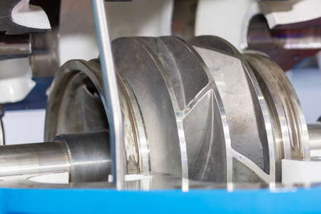 Turbine generator rotor with blades and discs, interior view. Elements, details and mechanisms of turbines. Energy and mechanical engineering