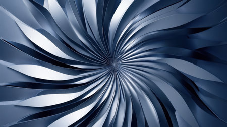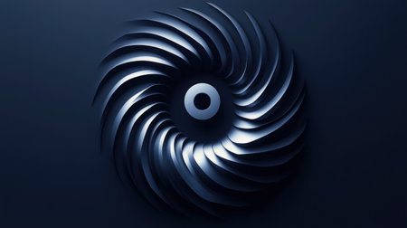 A spiral of sharp blades on a dark blue backdrop mesmerizes viewers.