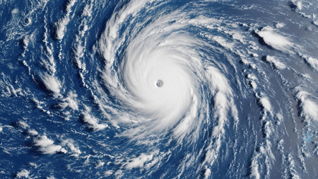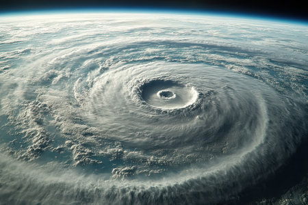 A high-altitude satellite captures a colossal storm system with a clear central vortex, showcasing sprawling spiral cloud formations over the deep blue sea.