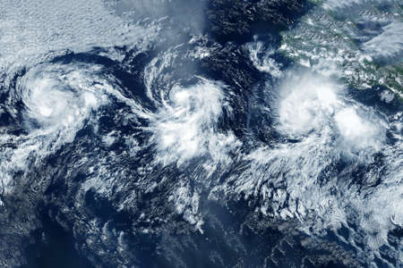 Extremely detailed and realistic high resolution 3d illustration of 3 hurricanes approaching Northeastern USA. Shot from space. Elements of this image are furnished by Nasa.
