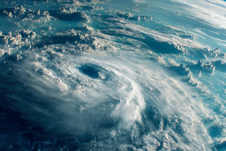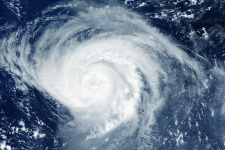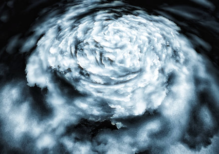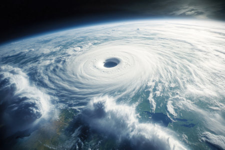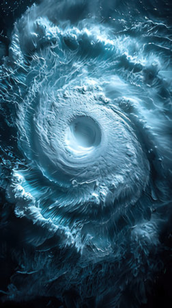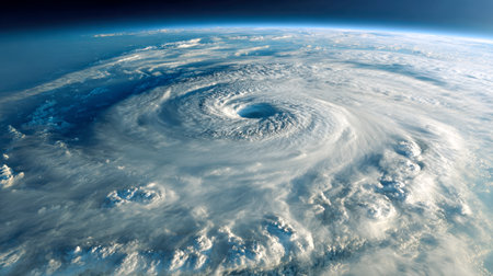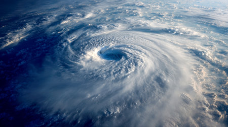 Majestic view of swirling clouds and intense vortex of a hurricane from a high altitude perspective.