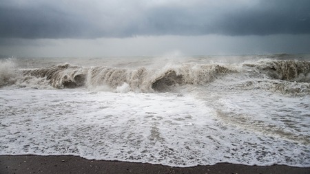 Autumn sea storm with splash from big waves at the beach