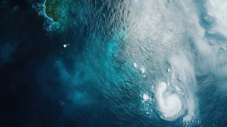 Stunning aerial capture of a powerful hurricane over the ocean, showing its swirling clouds and clearly defined eye at the center, depicting the immense force and beauty of nature's fury. AI generated image