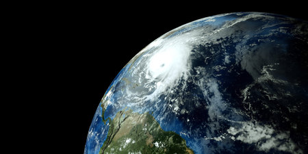Extremely detailed and realistic high resolution 3d illustration of hurricane irma approaching the Caribbean Islands. Shot from space.