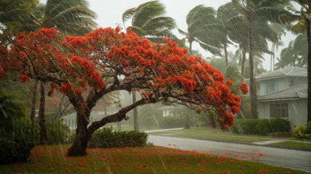 Royal poinciana in a storm, heavy rain pouring down, strong winds twisting their leaves