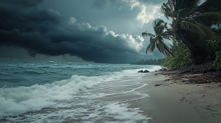 Waves roll fiercely towards the beach under an ominous sky filled with dark storm clouds. The energy of the ocean contrasts against the threatening atmosphere during sunset.