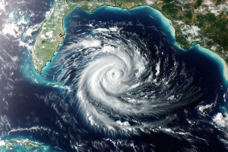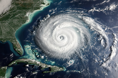 A fierce hurricane swirls over the Gulf of Mexico, approaching the shores of Florida with strong winds and rain.