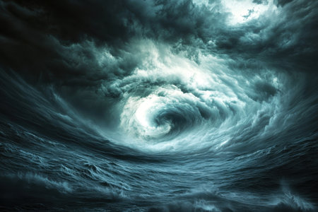 Hurricane eye spiraling above the ocean, dense fast moving clouds forming a massive vortex that showcases violent, destructive weather and atmospheric turbulence from above